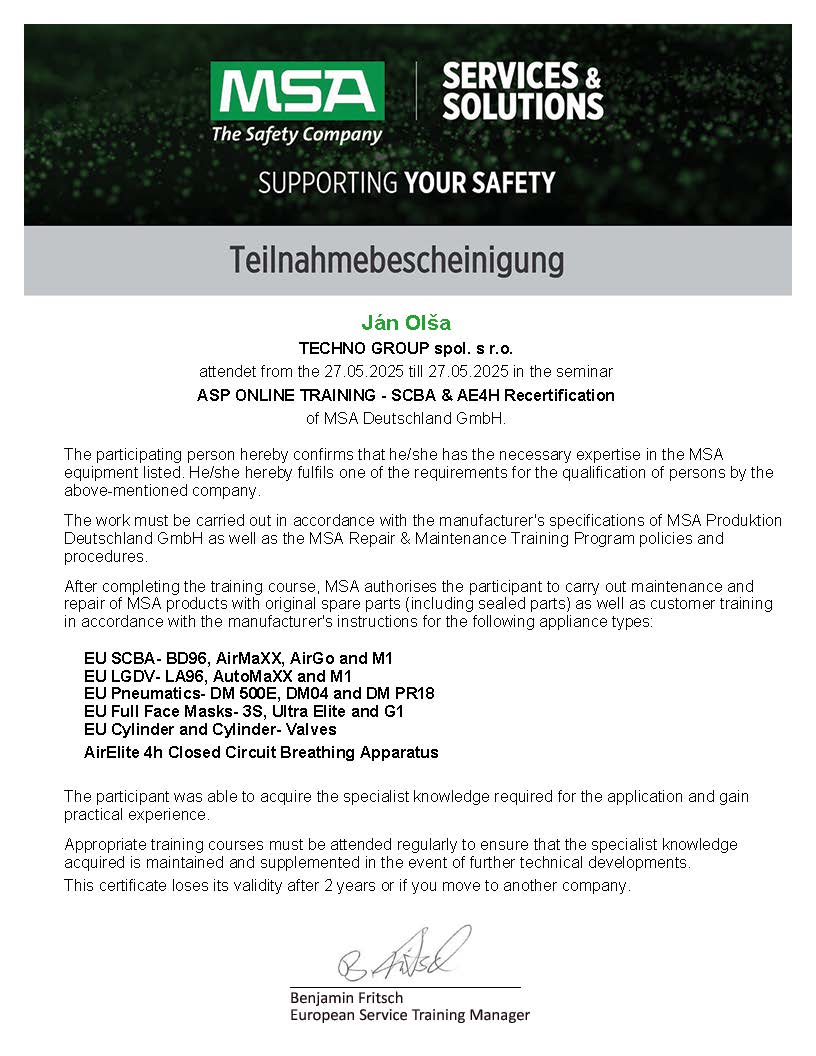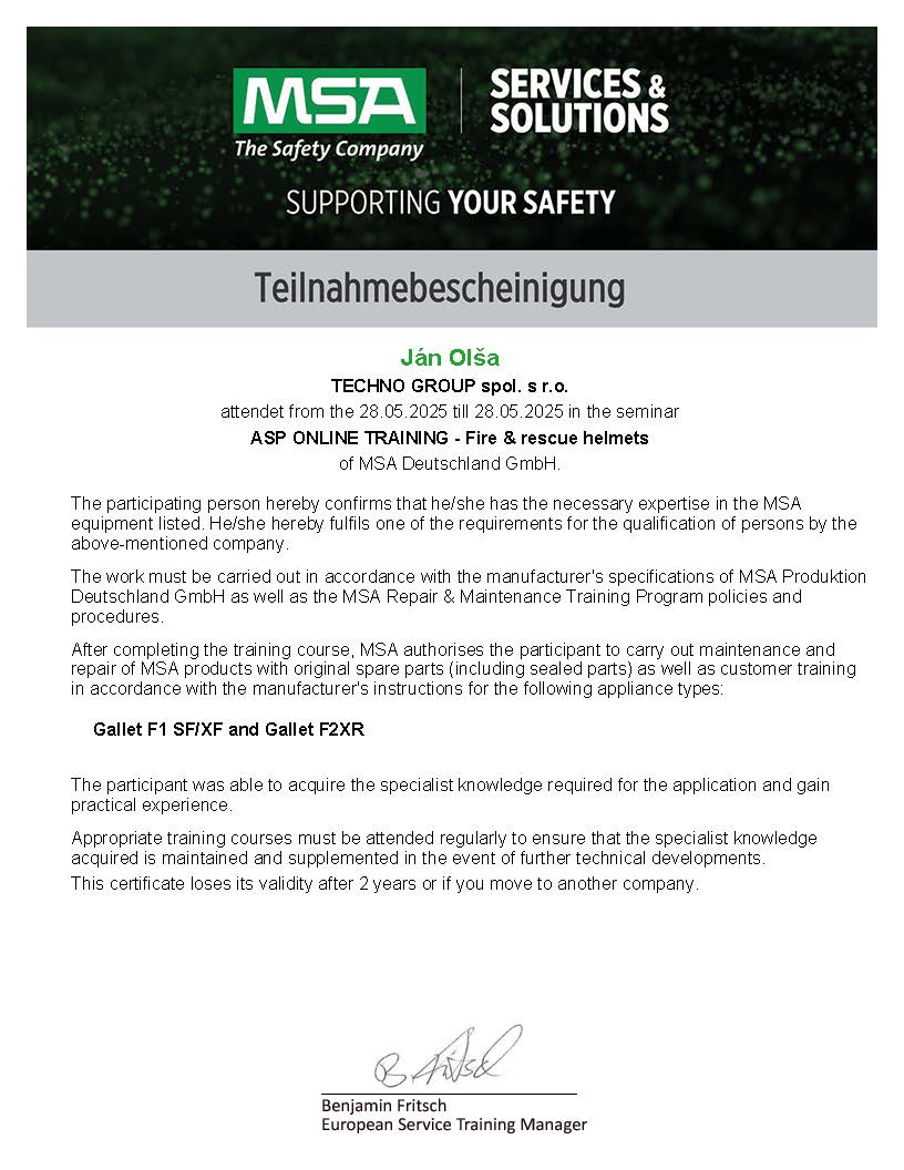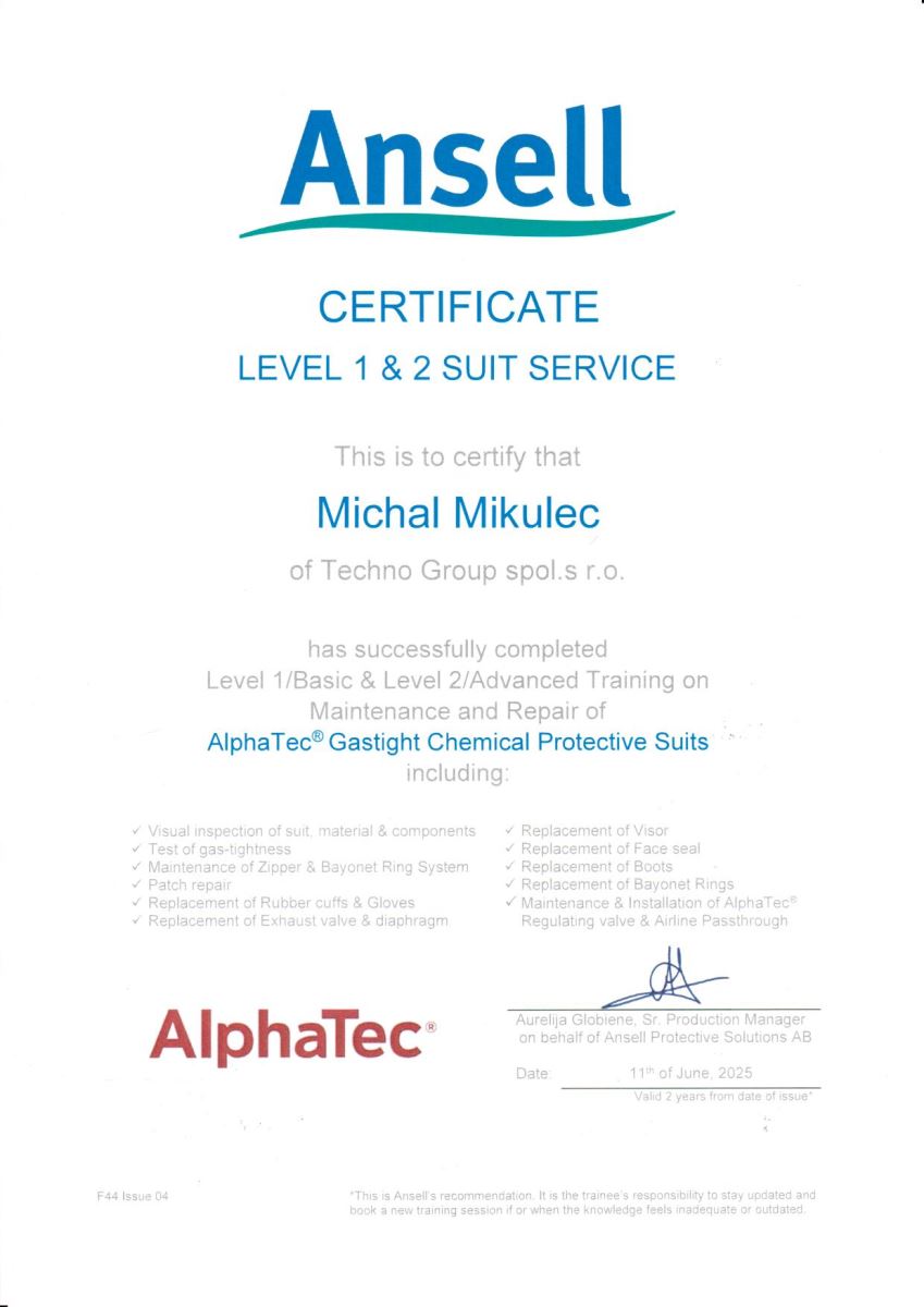 Certifikáty servisných technikov na servis protichemických oblekov