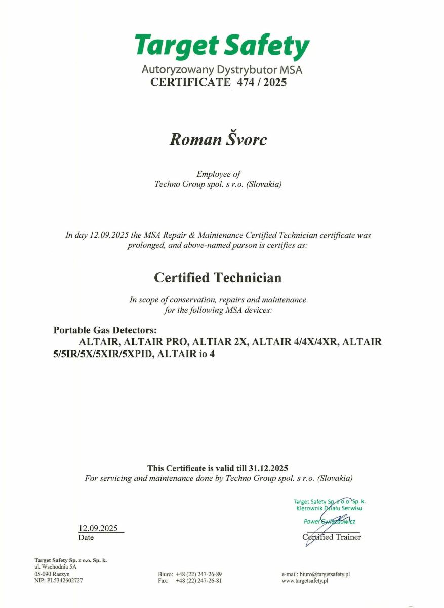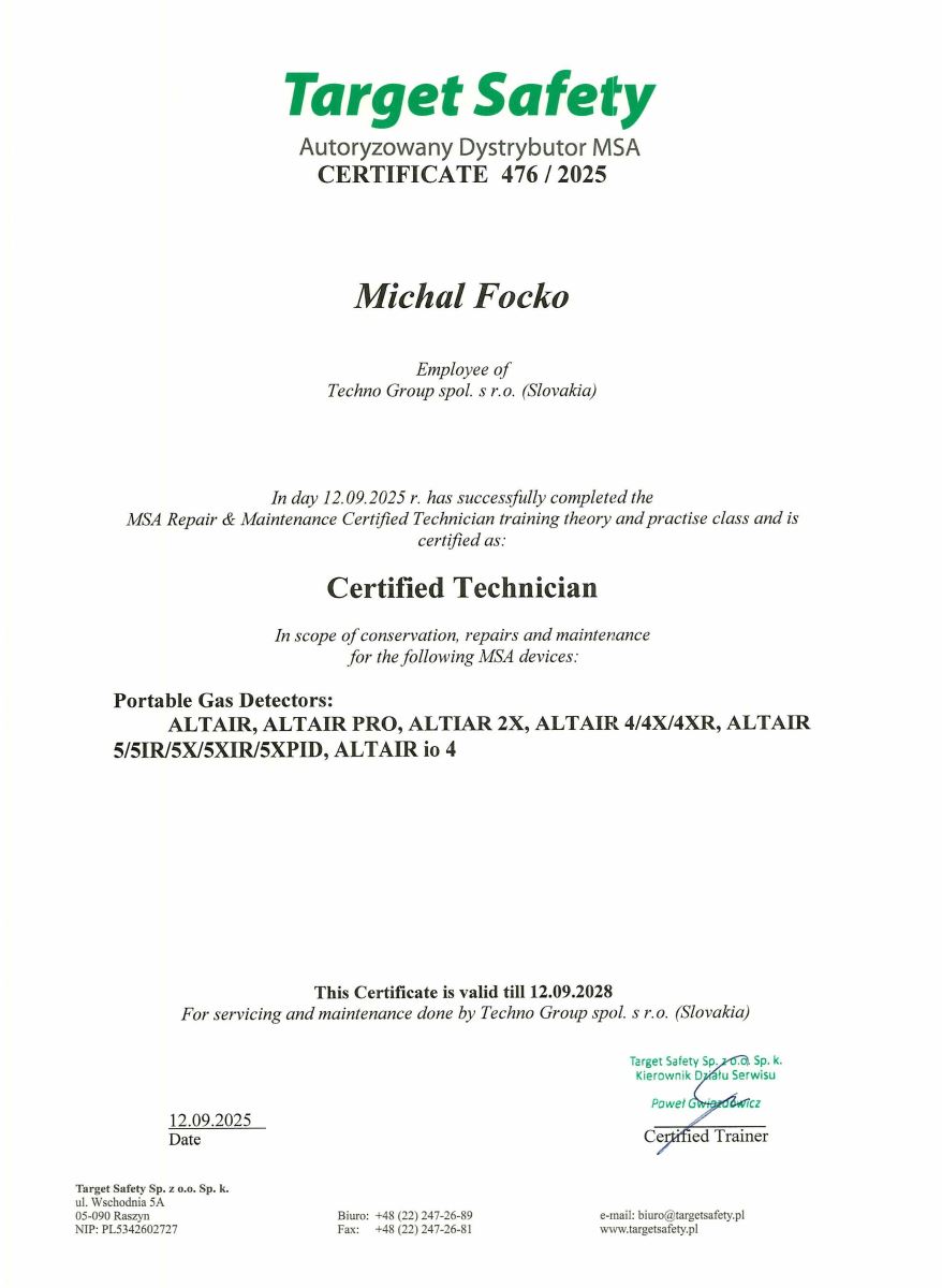 Certifikát servisného technika na servis detekčných prístrojov